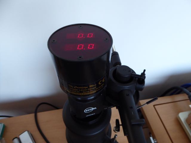 Temu sledi namestitev odjemne doze, najprej samo »na oko« tako, da bomo lahko izvedli naslednjo pomembnejšo nastavitev, nastavitev pritiska. Ročko je treba najprej postaviti približno v »ravnovesje« skupaj z odjemno dozo tako, da poskušate doseči »plavanje v zraku«, kar je prav tako precej težko, ampak tu malenkostna nenatančnost nima posledic, saj bomo v nadaljevanju tako ali tako dodajali težo. To opravimo z vrtenjem zgornje uteži in sproti v nekaj fazah preverjamo rezultat z digitalno tehtnico. Ker se mi je stara The Cartridge Man tik pred prihodom ročice po 15. letih pokvarila, sem si kupil Ortofonov model DS-3 in lahko rečem, da je odlična, natačna in zanesljiva. Meritve so bile namreč popolnoma konsistentne in pri večih merjenjih niso odstopale niti za desetinko grama. Benz LPS pri meni deluje najbolje z dvo gramsko obtežitvijo, zato sem tudi v tem primeru ostal pri tej vrednosti.