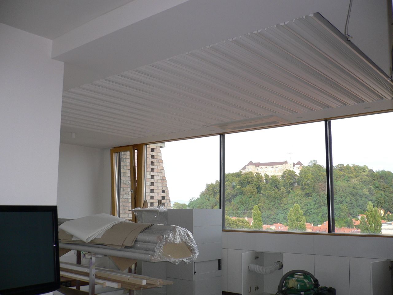 Veliki ovalni reflektor je izdelal mizar, ki je tudi sicer naredil pohištvo, ostalo sem kupil v ZDA ali Angliji direktno pri proizvajalcu. Žal nimam fotke s prav vsemi aplikacijami, tale spodaj je bila narejena po namestitvi prvih treh BAD panelov na strop. Plise zavese so skrite v posebnem in samo za to narejeni odprtini nad okni.