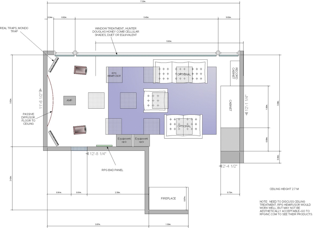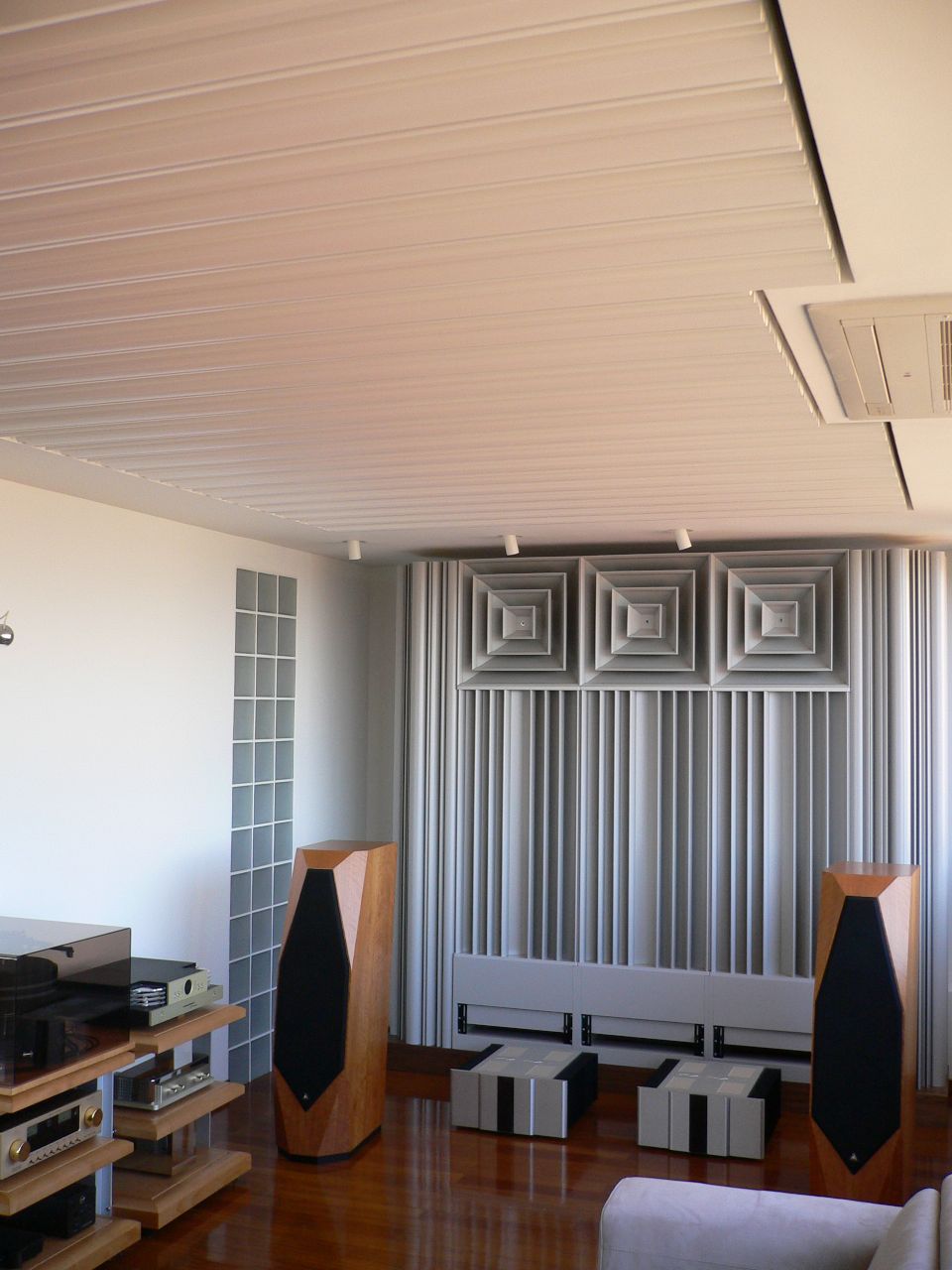 S časom so se prostorske potrebe moje družine povečevale in selitev v novo stanovanje je bilo samo še vprašanje časa. Stanovanje v katerem bivamo zadnja tri leta je večje, bolj zračno, svetlo...itn, vendar je stavba v glavnem narejena iz železobetona. Kot je splošno znano, ta material ni idealen v akustičnem smislu in tudi z opekami pregrajeni prostori niso dosti pomagali. Ko sem sistem priključil v novi dnevni sobi sem bil šokiran. Ločen, samo avdio sistemu namenjen električni tokokrog, ni prav nič pomagal. Tako dobesedno zanič zvoka nisem pričakoval in vse skupaj me je spominjalo na neuspešne sejemske predstavitve. Katastrofa! No, kaj pa zdaj? Po nekajmesečni žalosti in obupu (nič ni pomagalo k boljšemu zvoku, prav nič!) in vsemogočih črnih scenarijih, sem se odločil, da je treba narediti kar se pač da, prostor urediti čim bolj brezkompromisno in če tudi po vsem tem ne bo nič bolje, sledi selitev ali prodaja sistema. Ja, tako daleč je to šlo. Sledili so pogovori s prijatelji in znanci, ki nekaj vedo o akustiki in iskanje primernega svetovalca oziroma firme, ki se s tem že dolgo vrsto let uspešno ukvarja. Ameriški Rives Audio (http://www.rivesaudio.com/) se mi je zdel dober izbor, tudi zaradi razumne cene. To podjetje, ki nudi predvsem usluge na področju svetovanja in načrtovanja prostorov za poslušanje glasbe, aplikacij samih pa ne izdeluje ali prodaja, mi je v pol leta naredilo spodbudne načrte za akustično ureditev in veselil sem se namestitve številnih aplikacij: velikega ovalnega reflektorja na steno za zvočniki (napolnjen s stekleno volno), pa RPG BAD panelov (Binarni Absorbcijski Difuzor) ali RPG Hemifuzorjev (preveč grdi za dnevno sobo!) na stropu in na mestih prvih odbojev, REAL Traps Mondo Traps bas trapov v kotih in pa Hunter Duglas Duette zaves (podobno kot plise vendar, če jih pogledamo v prerezu imajo obliko čebeljega satja tako, da so precej bolj učinkovite kot klasičen plise), preko oken. Takole naj bi vse skupaj izgledalo.